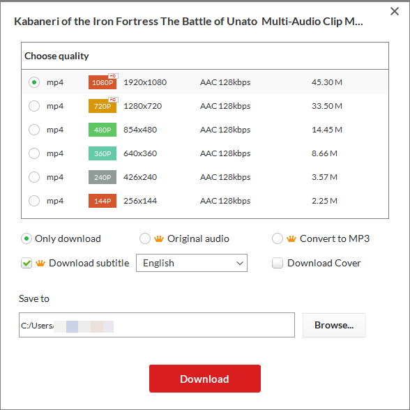 5. After the parsing is completed, a resolution selection window will pop up. In the resolution selection window, select the resolution of the ad video you want to download, and you can choose whether to download subtitles (some advertising videos also have subtitles).