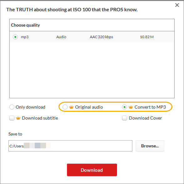 Step 3: After the program finishes analyzing the link, a window will pop up and you just need to check the "Download Original Audio" or "Convert to MP3" option. Then click "Download" to let the software start converting the YouTube video to MP3 or M4A.